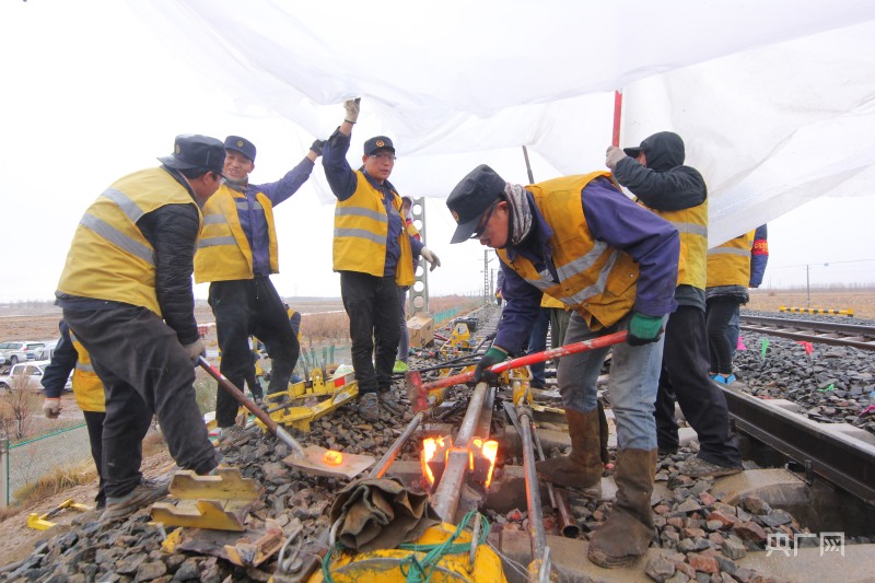 但這還不夠,為了讓鋼軌充分舒放“筋骨”、釋放應(yīng)力,職工們還必須切開鋼軌,緊接著進(jìn)行焊聯(lián),這項(xiàng)工作由德令哈重點(diǎn)維修車間負(fù)責(zé)。車間主任郭鋒亮一邊組織職工開動(dòng)切割機(jī)實(shí)施精準(zhǔn)切割,一邊組織職工架起焊鍋。火花飛舞,火苗竄升,作業(yè)人員的對(duì)比服在火光和風(fēng)雪的映襯下顯得更加熠熠生輝。最終,做完“伸展運(yùn)動(dòng)”的鋼軌在焊劑的作用下重新融合在了一起,經(jīng)打磨后再難區(qū)分彼此。