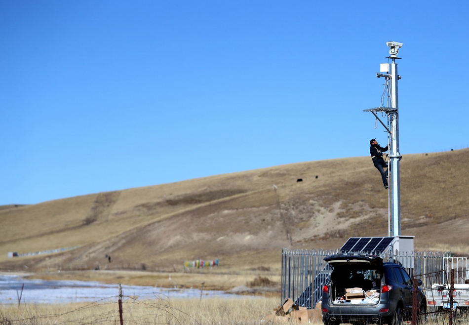 工作人員在尕海湖邊安裝遠(yuǎn)程視頻監(jiān)測監(jiān)控。