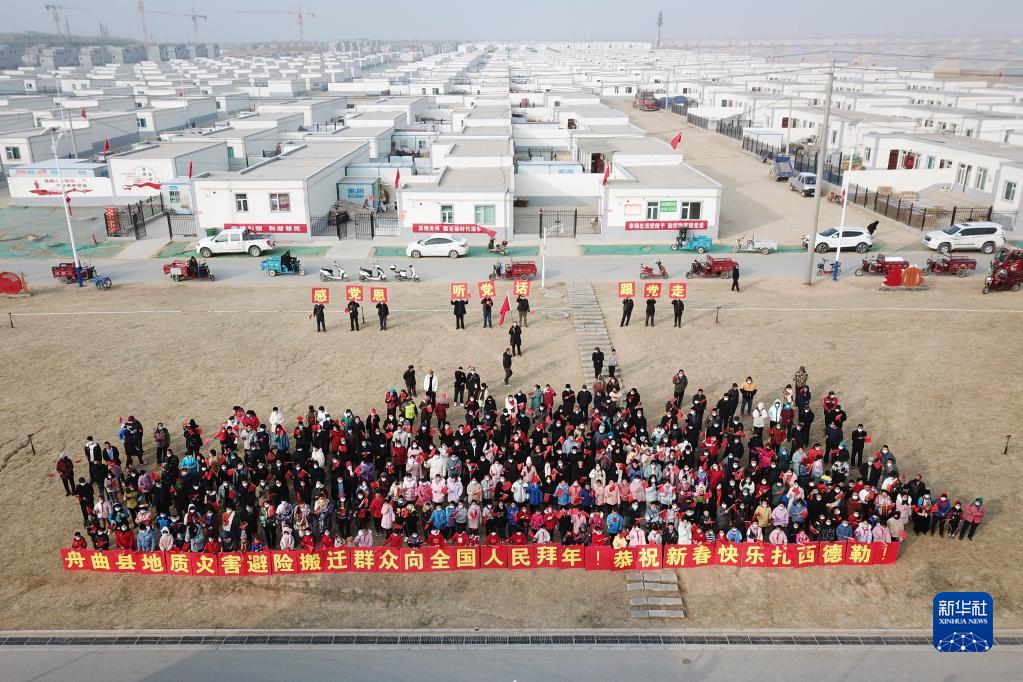在蘭州新區(qū)舟曲避險搬遷安置點,搬遷群眾向全國人民拜年(1月24日攝,無人機照片)。新華社記者 范培珅 攝