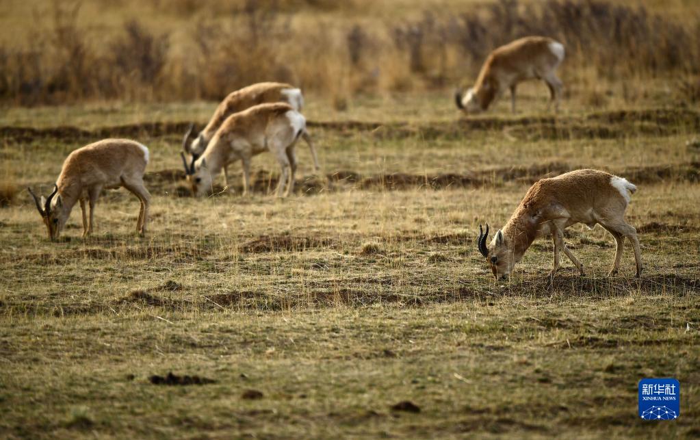 2018年4月26日,一群普氏原羚在青海省海北藏族自治州剛察縣哈爾蓋鎮(zhèn)附近的草原覓食。新華社記者 張宏祥 攝
