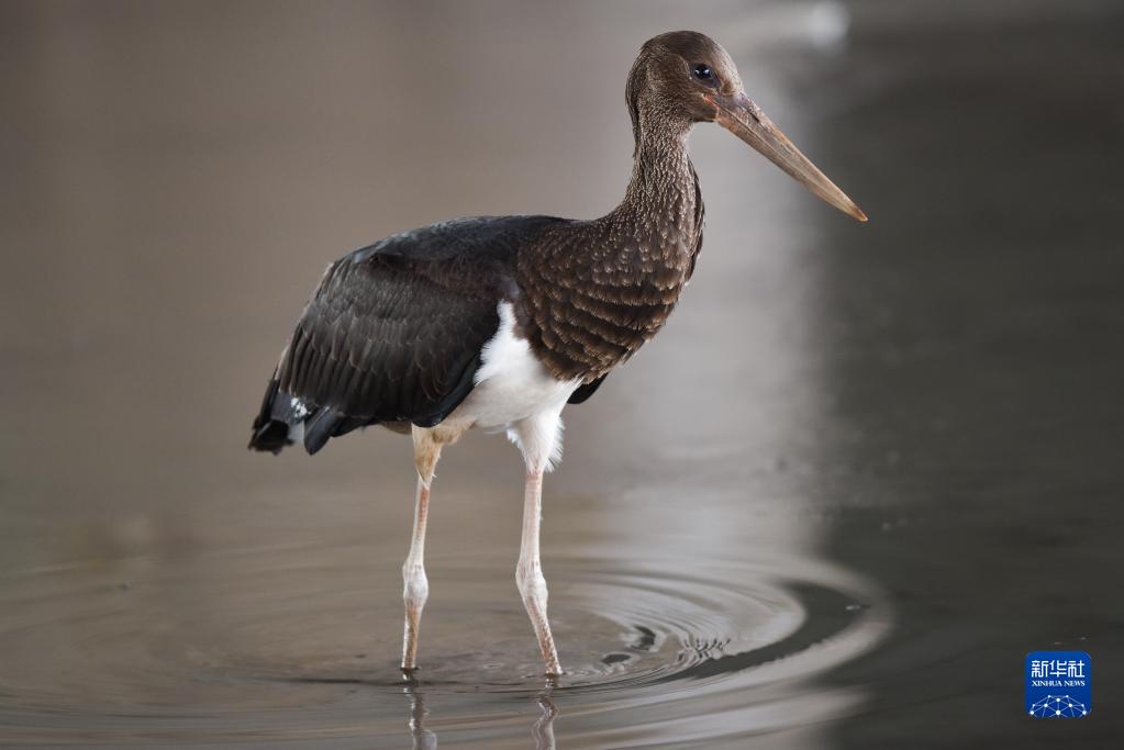 2020年12月6日,一只黑鸛在西寧市北川河濕地公園內(nèi)覓食。新華社記者 吳剛 攝