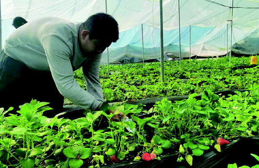 走進種植園,一派熱火朝天的工作景象。種植員疏花疏果,設(shè)施工人爬上塑料薄膜大棚進行日常監(jiān)測維修……所有工作都在有條不紊地進行,為優(yōu)質(zhì)草莓生長提供保障。