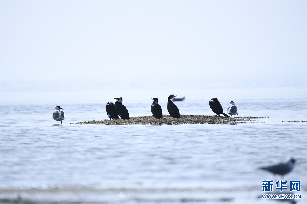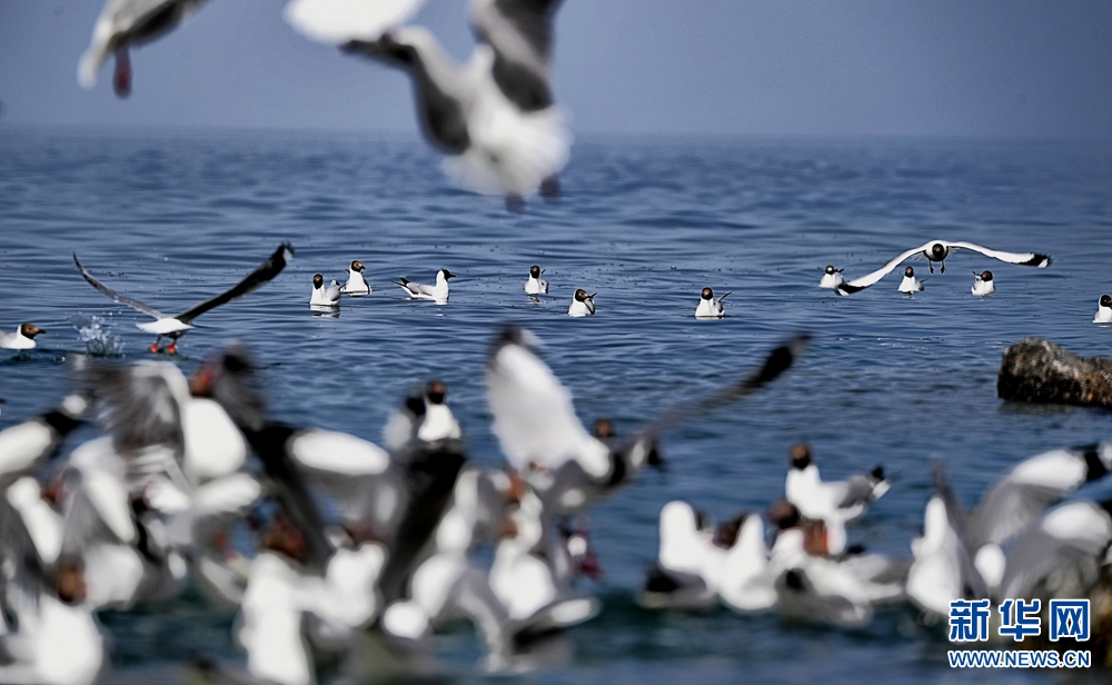 水鳥(niǎo)在青海湖上嬉戲。新華網(wǎng) 潘彬彬 攝