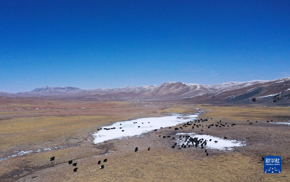 4月19日,在青海省玉樹藏族自治州曲麻萊縣,牦牛在草原上覓食(無(wú)人機(jī)照片)。新華社記者 張龍 攝