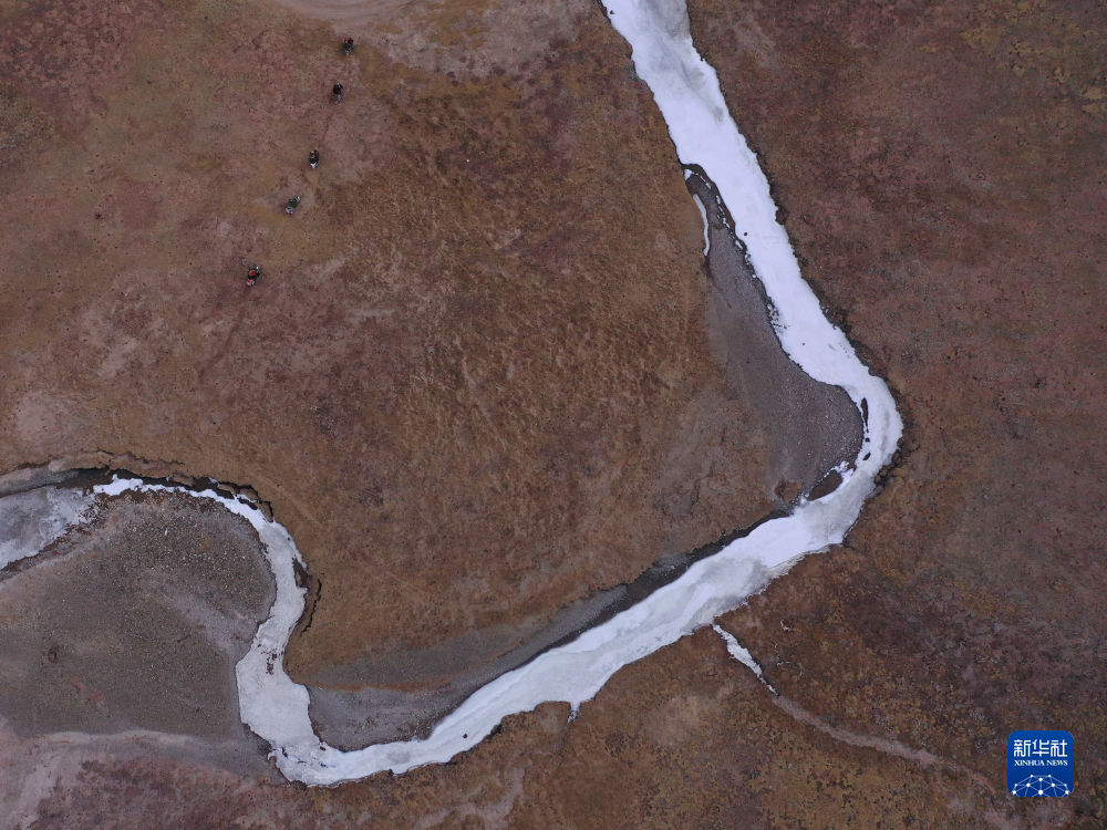 4月21日,在青海省玉樹藏族自治州曲麻萊縣麻多鄉(xiāng)約古宗列曲附近,生態(tài)管護(hù)員在巡護(hù)(無人機(jī)照片)。新華社記者 張龍 攝