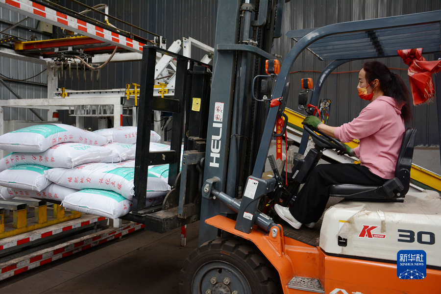 新華村生態(tài)有機(jī)肥加工廠內(nèi),工人正在用叉車搬運(yùn)肥料。新華社記者 柳澤興 攝