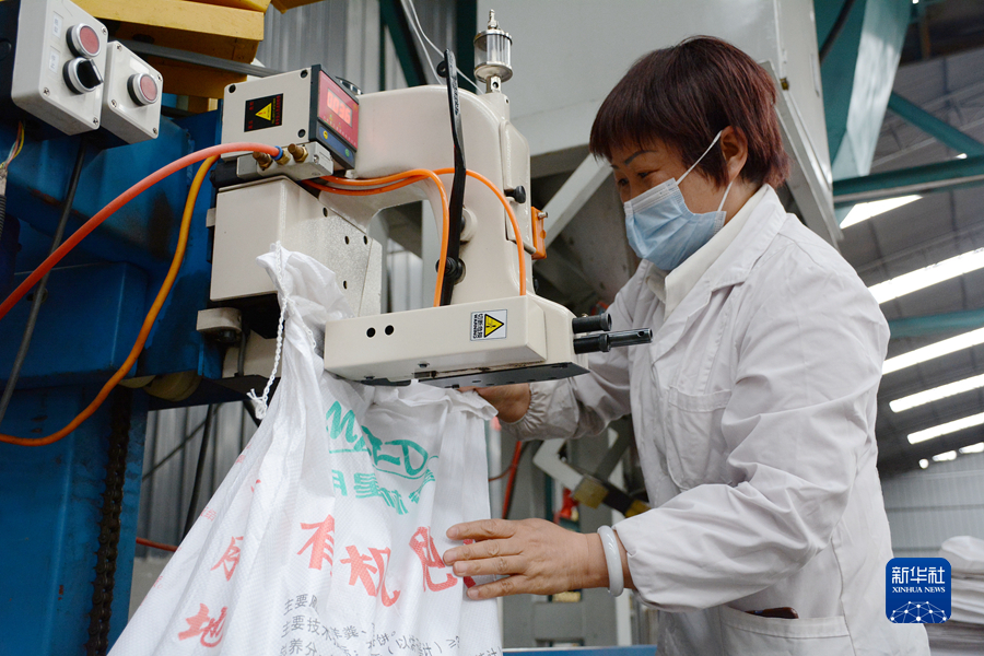 技術(shù)員王紅正在進(jìn)行有機(jī)肥密封操作。新華社記者 柳澤興 攝