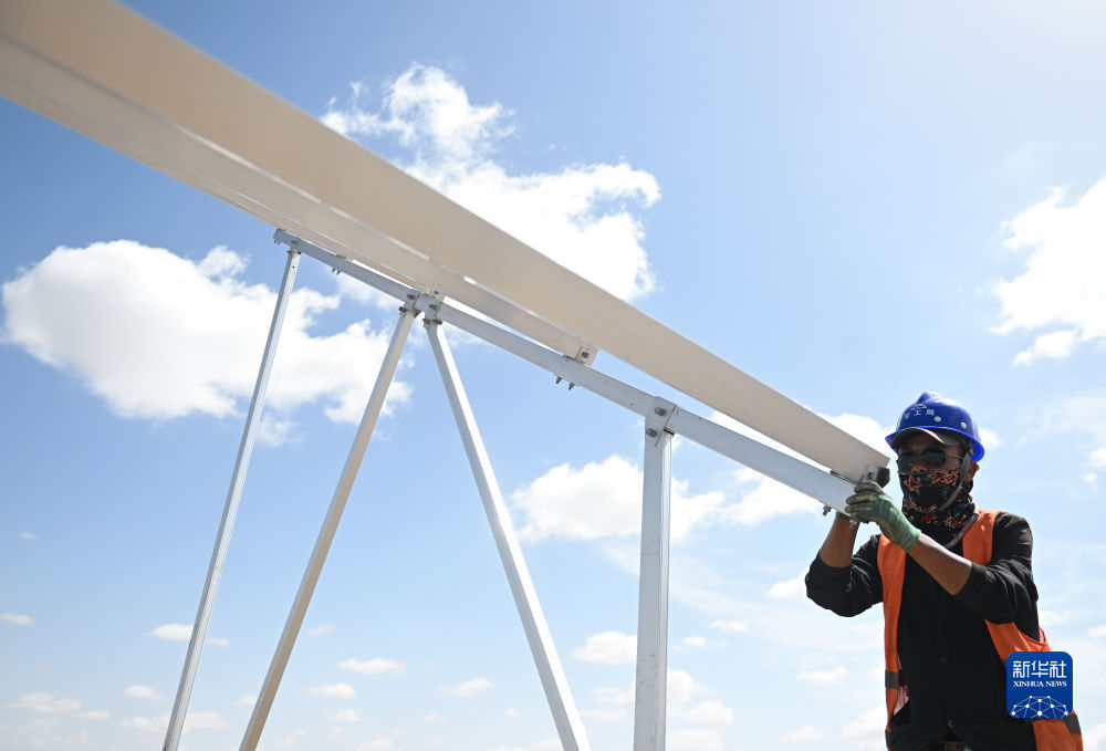6月8日,工人在黃河上游水電開發(fā)有限責(zé)任公司海南基地共和縣100萬千瓦光伏項目施工。新華社記者 周盛盛 攝