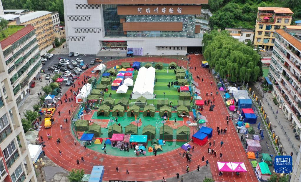 6月10日拍攝的馬爾康市州醫(yī)院背后廣場(chǎng)安置點(diǎn)(無人機(jī)照片)。新華社記者 劉坤 攝