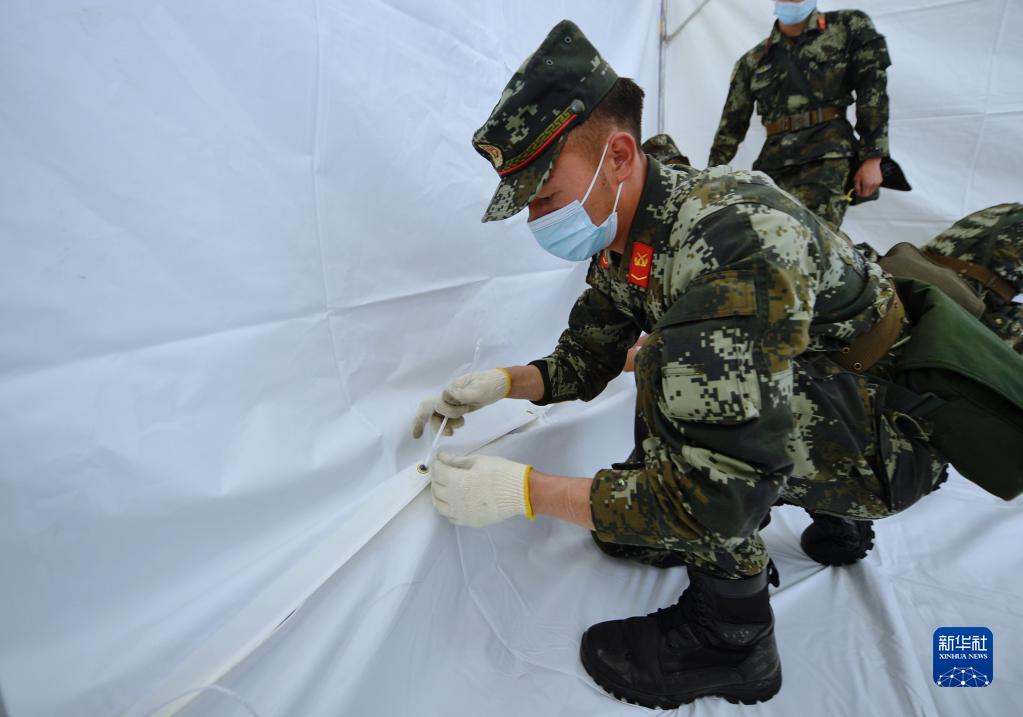 6月10日,在馬爾康市州醫(yī)院背后廣場(chǎng)安置點(diǎn)內(nèi),武警阿壩支隊(duì)隊(duì)員在搭建帳篷。新華社記者 劉坤 攝