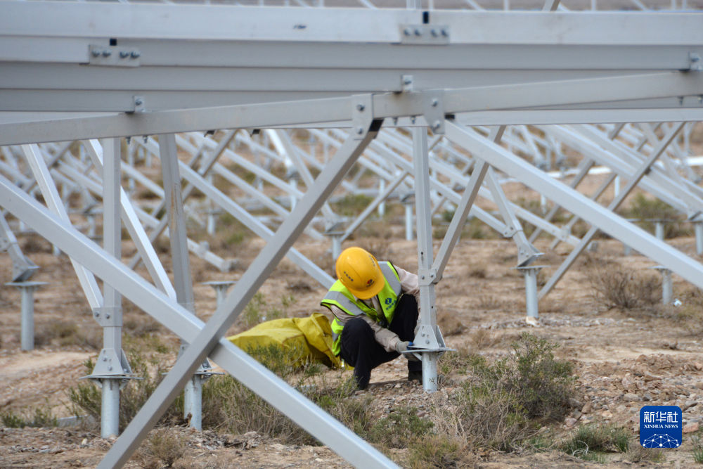 6月7日,在國家電投集團(tuán)黃河公司德令哈220萬千瓦多能互補(bǔ)項(xiàng)目一期100萬千瓦光伏項(xiàng)目建設(shè)現(xiàn)場,工人安裝光伏支架。新華社記者 范培珅 攝