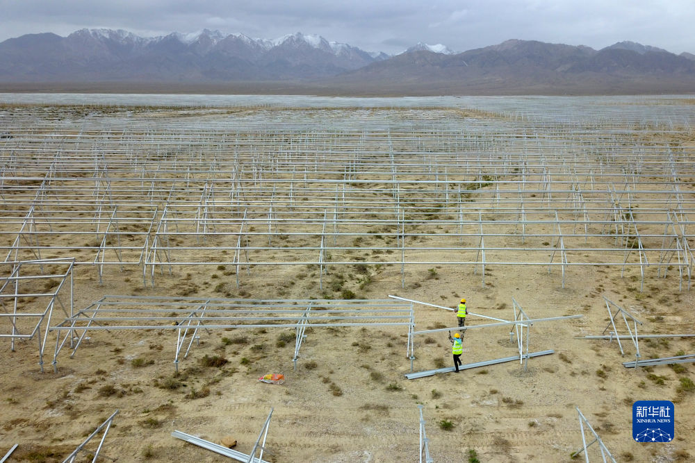 6月7日,在國家電投集團(tuán)黃河公司德令哈220萬千瓦多能互補(bǔ)項(xiàng)目一期100萬千瓦光伏項(xiàng)目建設(shè)現(xiàn)場,工人在安裝光伏支架。新華社記者 王浡 攝