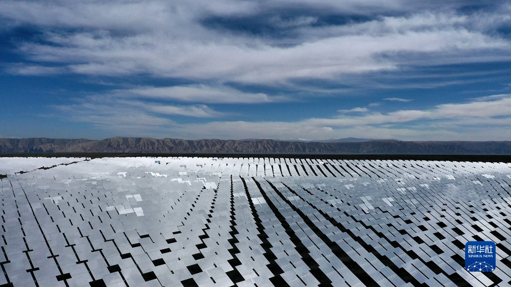 陽光照射蔚藍的電池板,光能便轉(zhuǎn)化成源源不斷的電能;風力發(fā)電機的葉片迎風飛轉(zhuǎn),風被“捕捉”進一條條輸電線;百米高的吸熱塔和“鏡子海洋”組成熔鹽塔式光熱電站,科技感與綠色減碳有機結(jié)合……