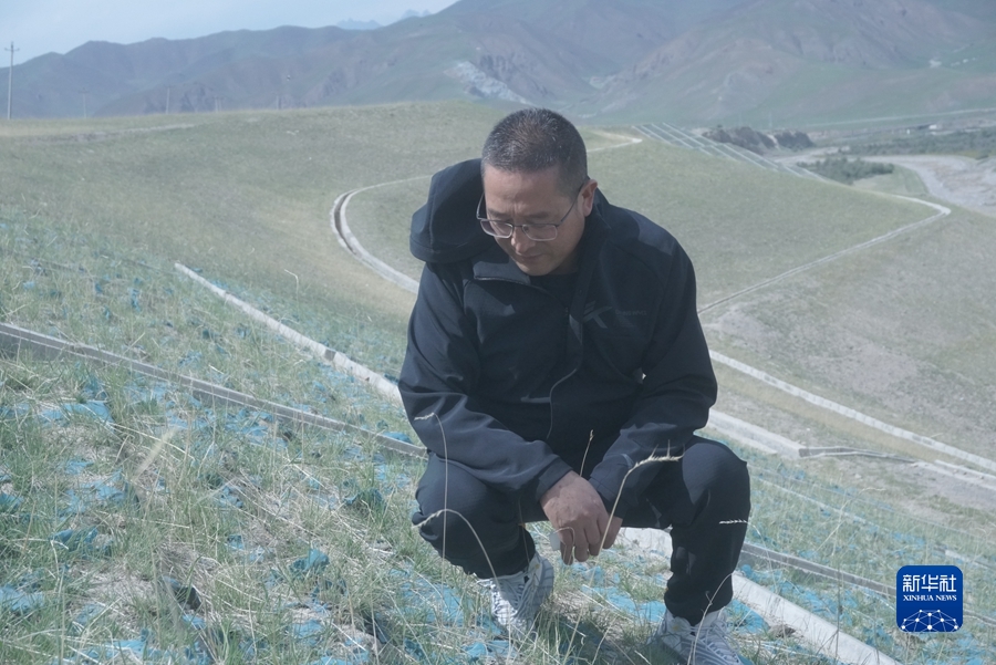 6月16日,祁連縣山水林田湖試點(diǎn)項(xiàng)目辦公室干部楊富存正在小八寶河河畔查看治理成效。新華社記者 周盛盛 攝