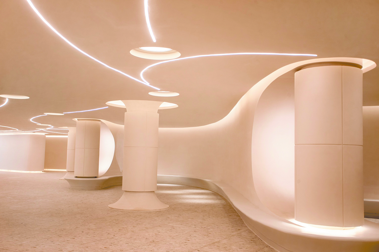 “看見九寨”大樓內(nèi)的10余個空間里,設(shè)計團(tuán)隊用不同的色彩和科技表現(xiàn)手法表達(dá)出不同的舒緩風(fēng)格,治愈人心?!蔼氉孕褋怼彼囆g(shù)館運用弧形和曲線,將空間切割出曼妙的身形,輕盈靈動,淺黃柔色的燈光彌漫著溫柔氣息;以白色調(diào)為主的“九寨時光”圖書館,能讓人從浮躁中快速安靜下來。