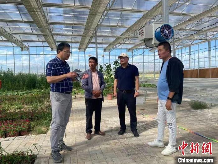 圖為范丹(左一)在當?shù)剡M行花卉種植產(chǎn)業(yè)指導。德令哈融媒體中心 供圖