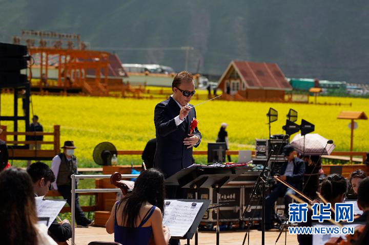 在海拔約3000米的油菜花海中,世界名曲、中國民歌依次奏起,花如海,樂如浪,音樂在山谷中回響。