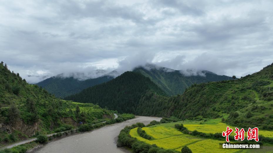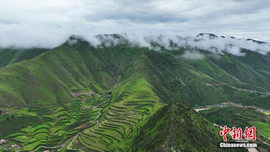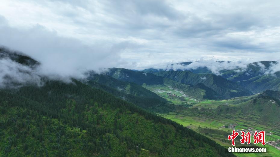 7月11日,一場降雨過后,云霧如潔白的哈達飄落在青海省果洛藏族自治州班瑪縣瑪可河國家森林公園山頭,與樹木、河流、梯田相互映襯,自然風(fēng)景美如畫。