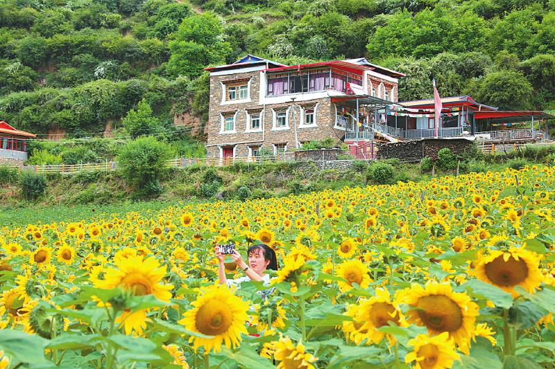 7月24日,從四川省阿壩藏族羌族自治州馬爾康市區(qū)出發(fā),行駛20多公里便抵達(dá)松崗鎮(zhèn)洛威村。一下車,成片的向日葵花海撲入眼簾,錯(cuò)落有致的藏式民居點(diǎn)綴其間。