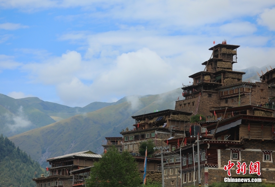 8月17日,日斯?jié)M巴碉房外景。日斯?jié)M巴碉房坐落于四川省阿壩藏族羌族自治州壤塘縣宗科鄉(xiāng)加斯?jié)M村石波寨,修建于元末明初,距今已有近700年的歷史。碉房共分九層,高25.6米,外型呈階梯狀,是一座保存完好的藏式傳統(tǒng)民居。2006年,日斯?jié)M巴碉房被列為全國重點文物保護單位。 中新社記者 王磊 攝