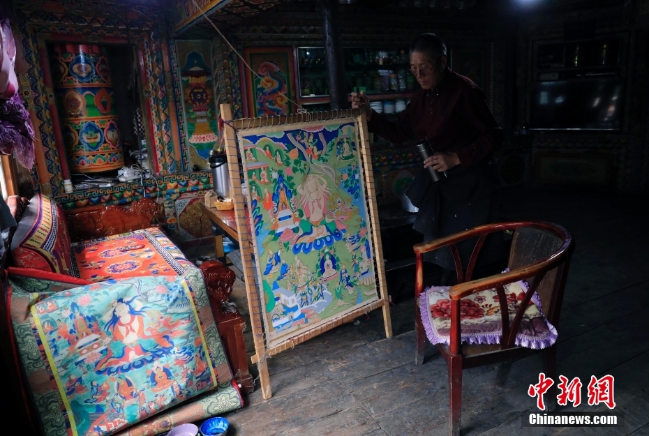 8月17日,日斯?jié)M巴碉房的主人洛吾王爾甲在客廳里準備繪制唐卡。日斯?jié)M巴碉房坐落于四川省阿壩藏族羌族自治州壤塘縣宗科鄉(xiāng)加斯?jié)M村石波寨,修建于元末明初,距今已有近700年的歷史。碉房共分九層,高25.6米,外型呈階梯狀,是一座保存完好的藏式傳統(tǒng)民居。2006年,日斯?jié)M巴碉房被列為全國重點文物保護單位。 中新社記者 王磊 攝