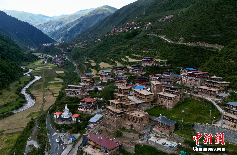 8月17日,航拍日斯?jié)M巴碉房外景。日斯?jié)M巴碉房坐落于四川省阿壩藏族羌族自治州壤塘縣宗科鄉(xiāng)加斯?jié)M村石波寨,修建于元末明初,距今已有近700年的歷史。碉房共分九層,高25.6米,外型呈階梯狀,是一座保存完好的藏式傳統(tǒng)民居。2006年,日斯?jié)M巴碉房被列為全國重點文物保護單位。(無人機照片) 中新社記者 王磊 攝
