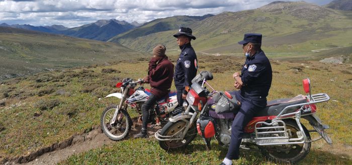 禾尼鄉(xiāng)派出所接到求助后,立即安排在附近開展工作的草原騎警隊(duì)警力寧紅玉、澤仁公布、格絨降措帶領(lǐng)熟悉附近地形的派出所群防群治義警隊(duì)員丁真稱乃,騎摩托車趕赴現(xiàn)場(chǎng)。期間,草原騎警隊(duì)協(xié)調(diào)附近牧民租借3臺(tái)摩托車前往迷路地方尋找,因迷路地點(diǎn)在海拔4800多米的高山,草原騎警隊(duì)翻山越嶺,經(jīng)過3個(gè)多小時(shí)的尋找,與迷路人員家屬在一山坳處找到德洛。家屬滿含熱淚的看著草原騎警隊(duì)隊(duì)員說,“麻煩你們了,謝謝你們了,你們辛苦了?!?/p>