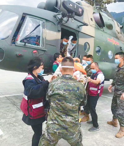 9月6日,在四川省瀘定縣瀘橋鎮(zhèn),四川省人民醫(yī)院赴瀘定醫(yī)療隊醫(yī)務人員正接診直升機轉運出來的傷員。王明峰 蘭昌文 攝