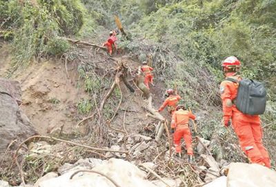9月6日,因道路損毀嚴重,四川省森林消防總隊特勤大隊二中隊隊員徒步前往瀘定縣磨西鎮(zhèn)燕子溝深處的大烏科村,搜尋被困群眾。宋豪新 曾鵬 攝