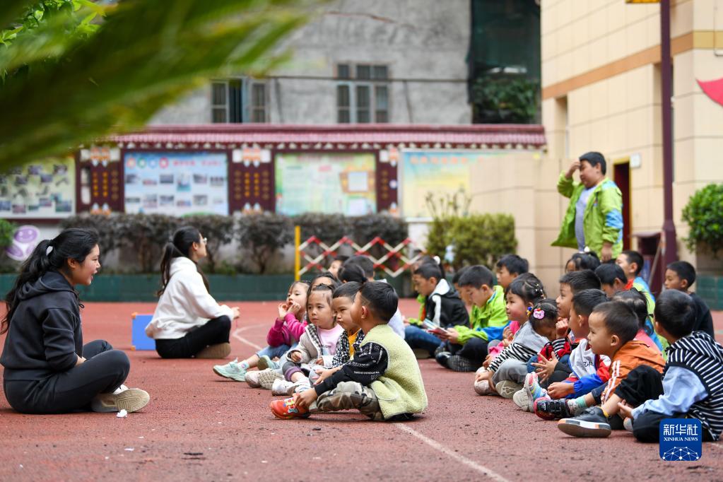 9月7日,在石棉縣草科鄉(xiāng)中心小學(xué)操場(chǎng)上,老師在給附屬幼兒園的小朋友上課。新華社記者 胥冰潔 攝