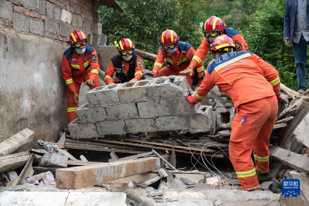 9月7日,四川眉山消防救援隊(duì)隊(duì)員在雅安市石棉縣王崗坪彝族藏族鄉(xiāng)幸福村二組,幫助村民在倒塌的房屋中找尋物品。新華社記者 才揚(yáng) 攝