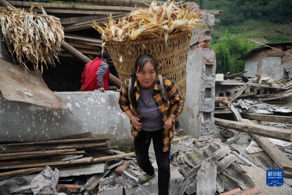 9月7日,在雅安市石棉縣王崗坪彝族藏族鄉(xiāng)幸福村二組,村民在倒塌的豬圈中搬運(yùn)苞米葉。新華社記者 才揚(yáng) 攝