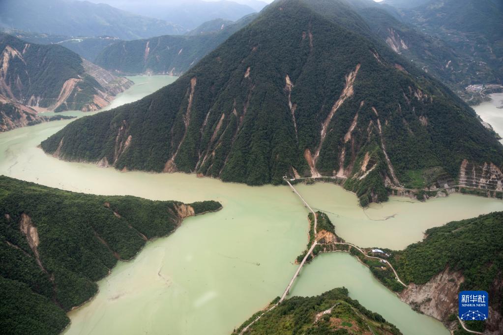 這是9月7日拍攝的雅安市石棉縣王崗坪彝族藏族鄉(xiāng)幸福村二組附近的照片,可看到山體多處滑坡(無人機(jī)照片)。新華社記者 才揚(yáng) 攝