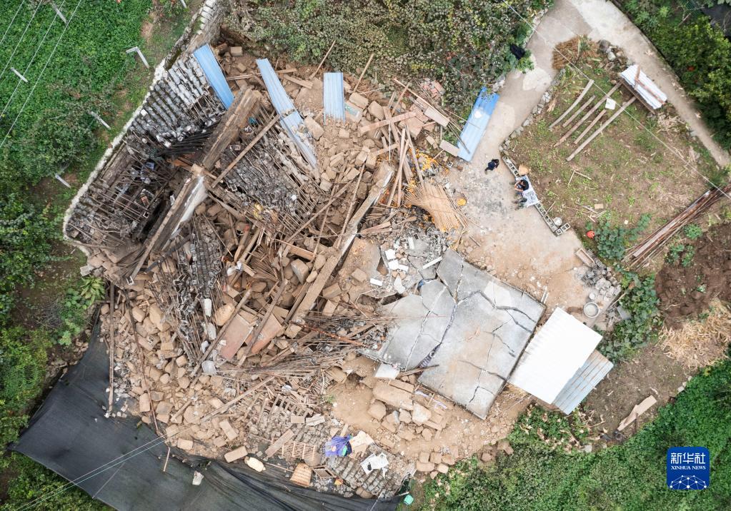 這是9月7日拍攝的雅安市石棉縣王崗坪彝族藏族鄉(xiāng)幸福村二組一戶倒塌的民房(無人機(jī)照片)。新華社記者 才揚(yáng) 攝