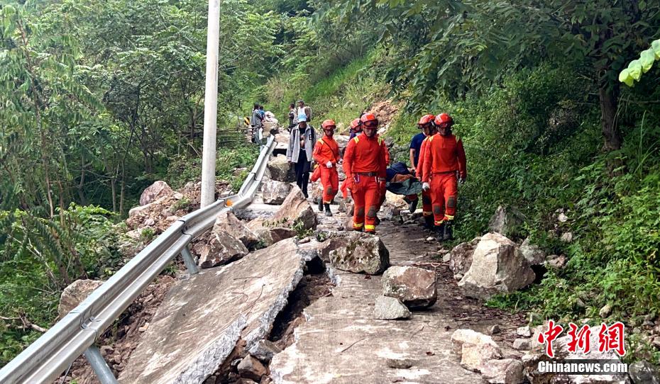 森林消防員抬著傷者通過地震中受損路段轉(zhuǎn)移。譚昊 攝