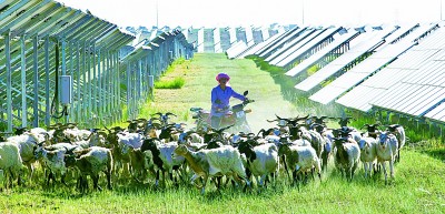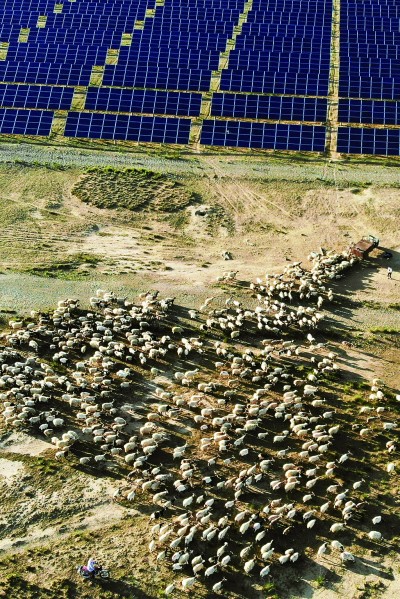在青海省海南藏族自治州共和縣的塔拉灘光電園區(qū),恰卜恰鎮(zhèn)上塔邁村的藏族牧民索南卓瑪騎著摩托車穿行在深藍(lán)色的光伏板間,驅(qū)趕羊群回圈飲水。