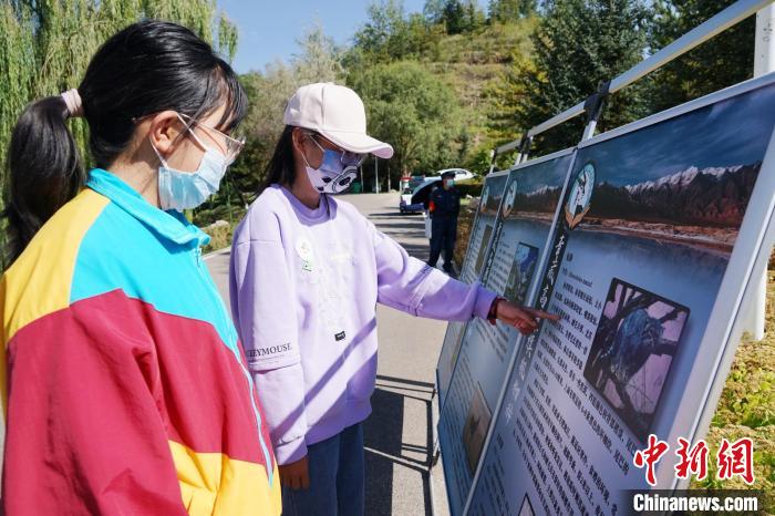 圖為青海野生動物救護繁育中心副主任通過展板向?qū)W生介紹兔猻。馬銘言 攝