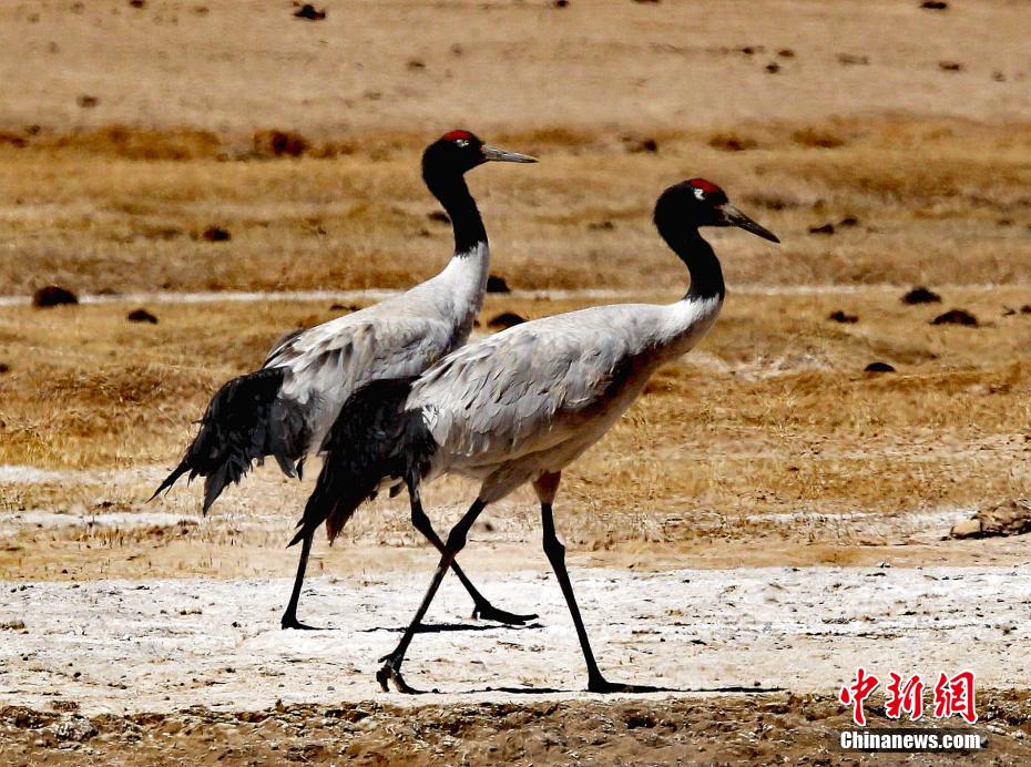 圖為一對黑頸鶴在草地上散步。才讓扎西 攝