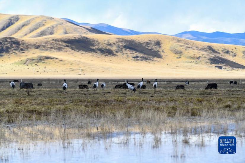 一群國(guó)家一級(jí)保護(hù)動(dòng)物黑頸鶴在四川省阿壩藏族羌族自治州若爾蓋縣的濕地活動(dòng)(2022年10月17日攝)。新華社記者 王曦 攝