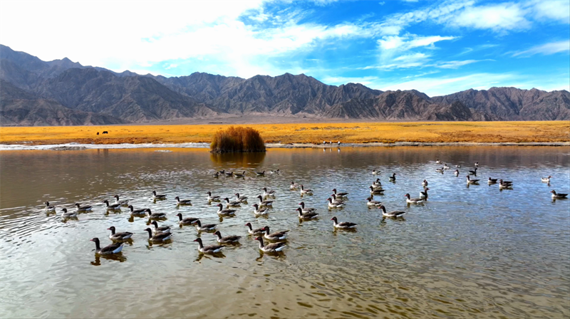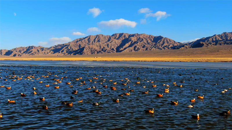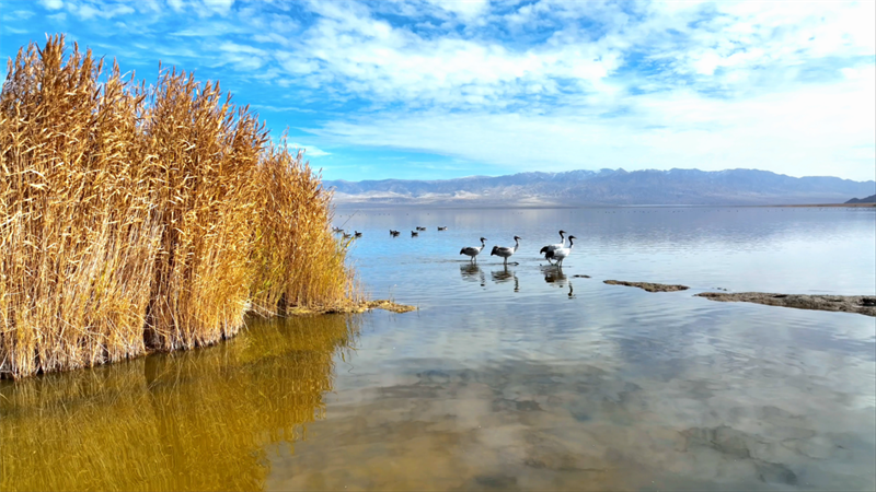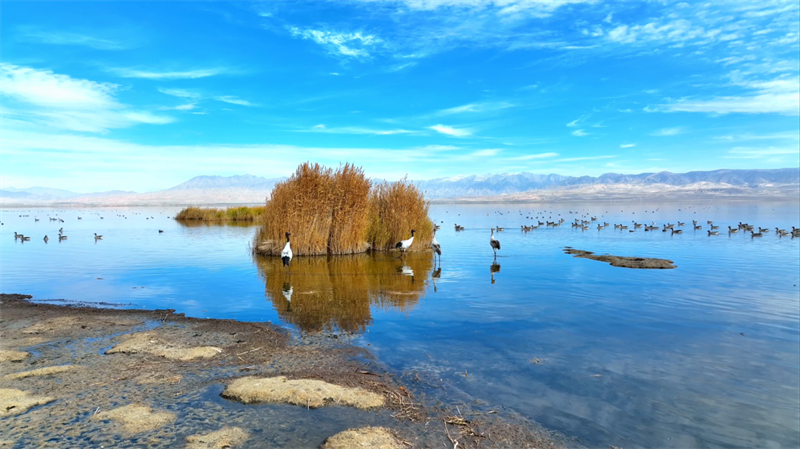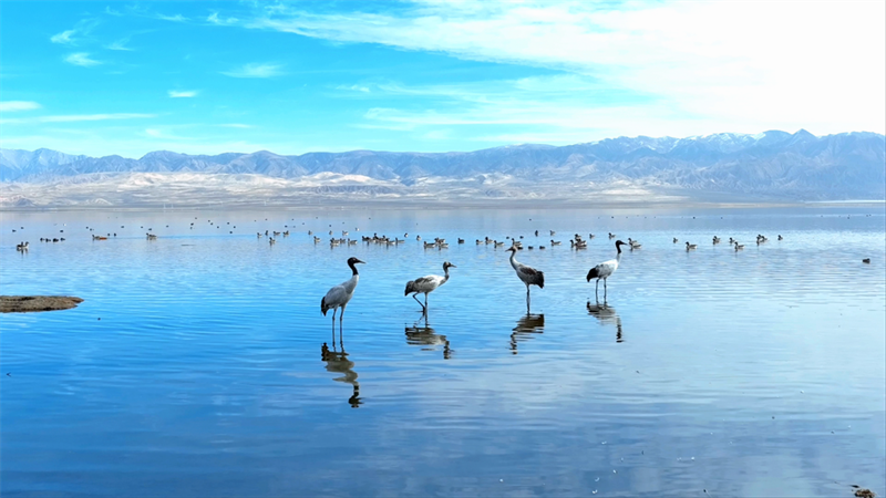 初冬時(shí)節(jié),在青海省海西蒙古族藏族自治州烏蘭縣都蘭湖國家濕地公園內(nèi),四只國家一級(jí)保護(hù)動(dòng)物黑頸鶴,踏著黑色細(xì)長的腿在湖中閑庭信步,與斑頭雁、赤麻鴨一起嬉戲覓食,盡顯柴達(dá)木盆地濕地生態(tài)之美。