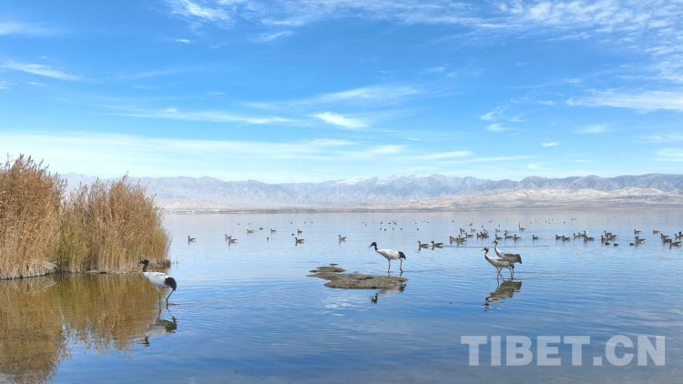 圖為“鳥類大熊貓”黑頸鶴在烏蘭縣東大灘徜徉