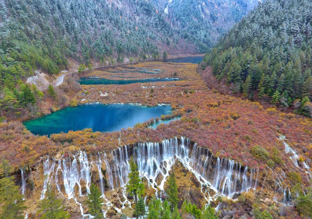 四川九寨溝景區(qū)諾日朗瀑布及諾日朗群海(2018年11月6日攝,無人機照片)。新華社記者 劉坤 攝