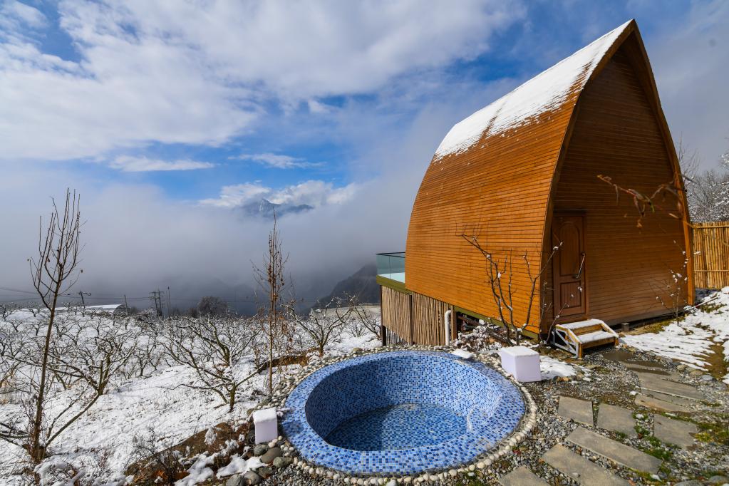 克枯村位于長江上游支流岷江邊的山腰上,是羌族聚居村寨。記者日前沿盤山公路進入村中看到,李子樹枝干上掛滿雪花,山林里6棟復式獨棟木屋民宿與遠處的雪山峽谷遙相呼應,旁邊是視野開闊的網(wǎng)紅餐廳,沿著旅游步道前行便看到幽蘭深邃的冰瀑群。