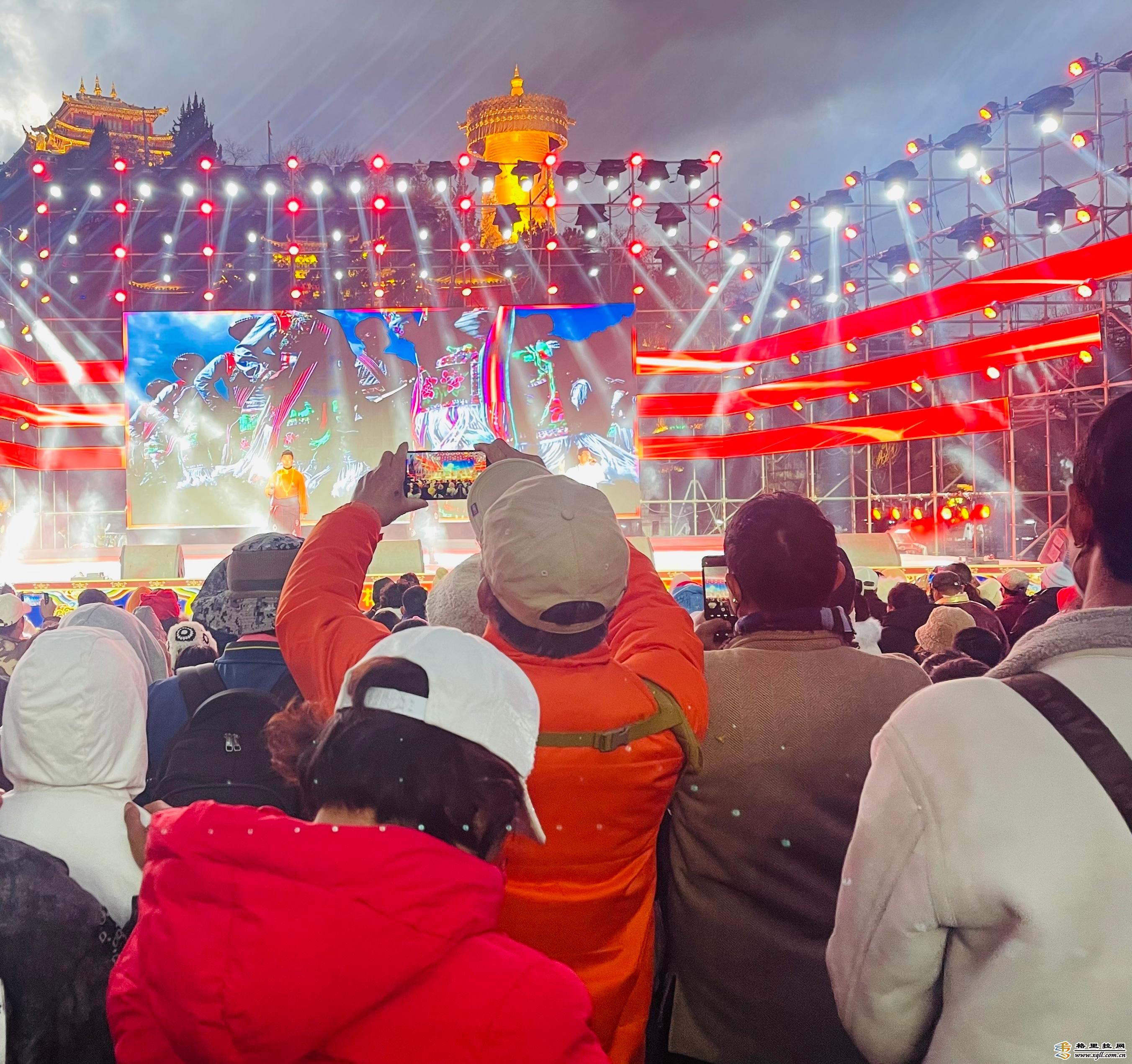 “我在古城月光廣場(chǎng),今晚這里有演唱會(huì)”“你快來啊,我在舞臺(tái)旁邊坐著等你”……2月21日19時(shí),距離“相約世界的香格里拉·本土歌手唱家鄉(xiāng)”演唱會(huì)開始還有20分鐘,本地居民、游客紛紛呼朋喚友聚集到香格里拉市獨(dú)克宗古城月光廣場(chǎng)。