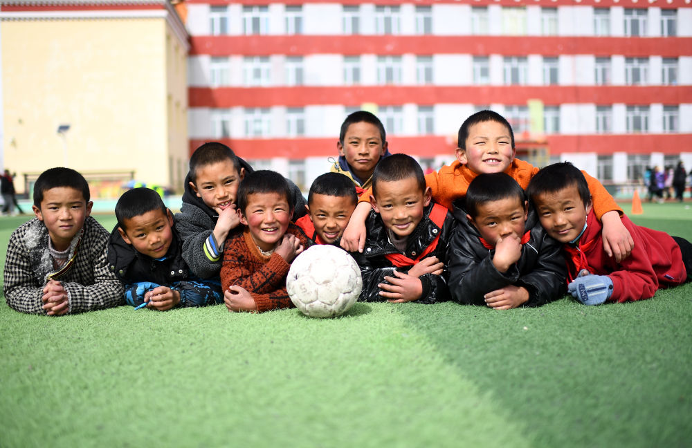 3月1日,在玉樹州治多縣,吉尕小學(xué)二年級(jí)學(xué)生才仁巴丁(左四)和小伙伴們?cè)趯W(xué)校的球場(chǎng)上。新華社記者 張宏祥 攝