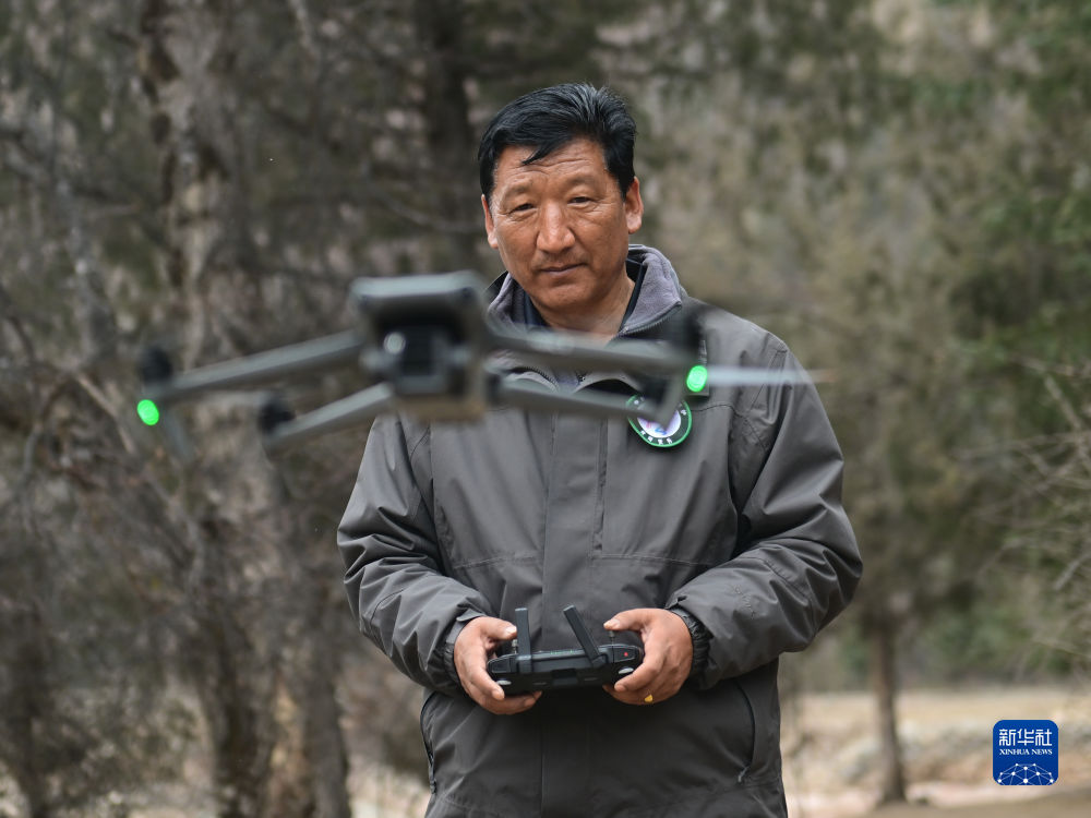 3月24日,在青海省黃南藏族自治州麥秀林場,護(hù)林員使用無人機(jī)巡護(hù)林區(qū)。新華社記者 王艷 攝