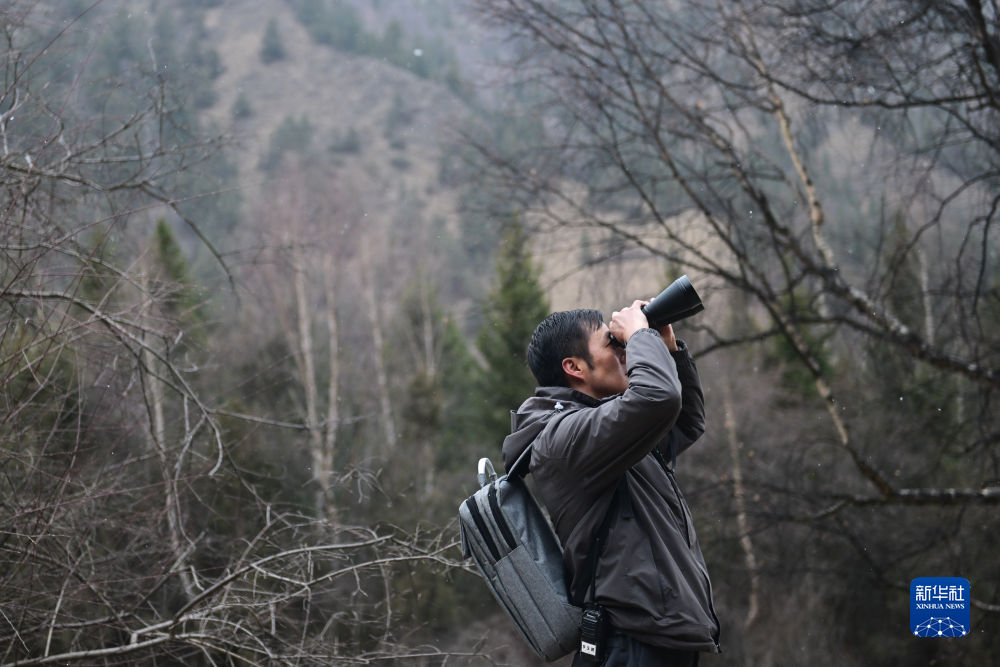 3月24日,在青海省黃南藏族自治州麥秀林場,護(hù)林員使用望遠(yuǎn)鏡巡護(hù)林區(qū)。新華社記者 張龍 攝