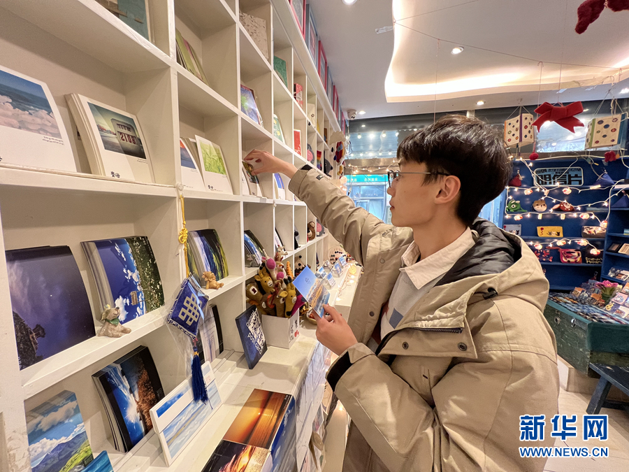 藍(lán)色的青海湖、金色的油菜花海、宛若明鏡的茶卡鹽湖……在青海省西寧市城中區(qū)莫家街一家文創(chuàng)小店里,來(lái)自山東青島的游客張開心正在店里挑選明信片。