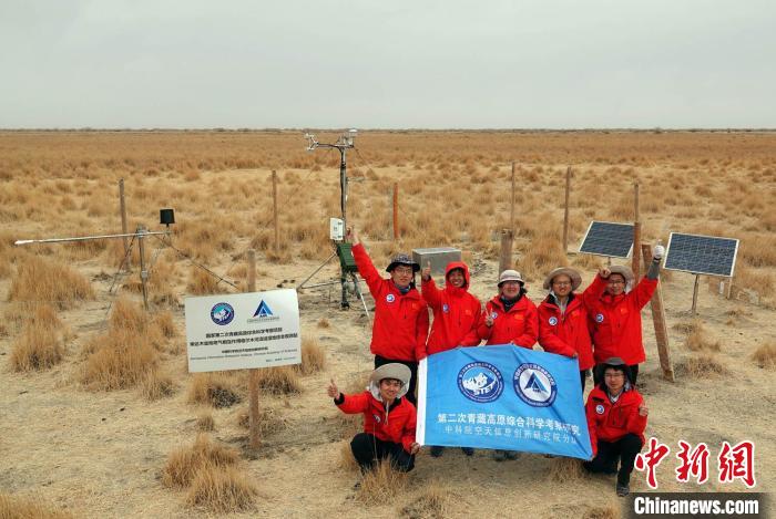 經過不懈努力,格爾木濕地站終于建成,第二次青藏科考中科院空天院分隊在站前合影慶祝。中新社記者 孫自法 攝