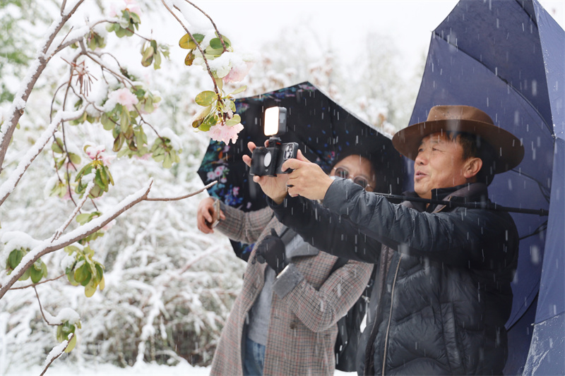 花映雪,雪融花,雪水晶瑩,花瓣嬌艷,攝影愛(ài)好者在大雪紛飛中記錄香格里拉的詩(shī)情畫(huà)意。